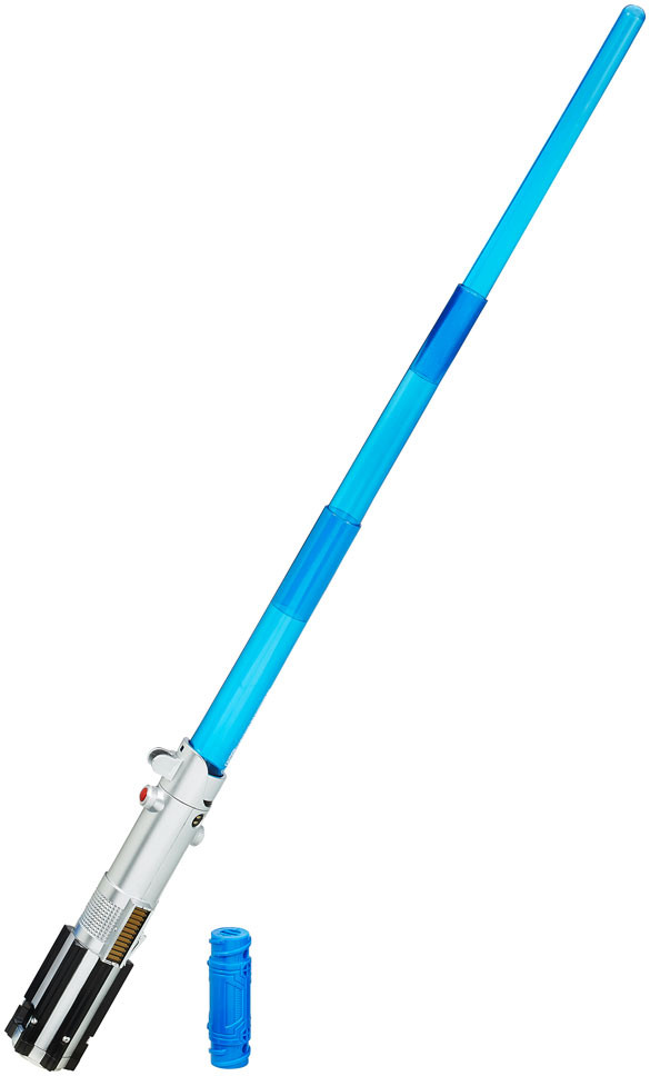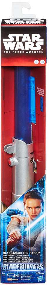 Hasbro presenterar Reys blå ljussabel från EpVII i deras Electronic Lightsabers BladeBuilders-serie.